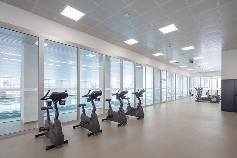 700 m² Plafonds métalliques perforés dans l'hall d'entrée, vestiaires et hall de sport