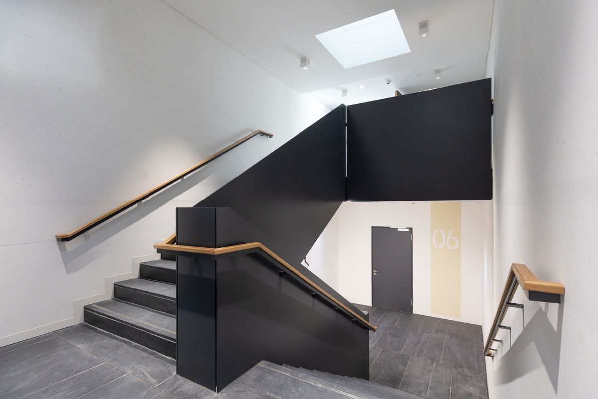 1.200 mètres linéaires de garde-corps en acier avec mains courantes en chêne dans les cages d'escalier