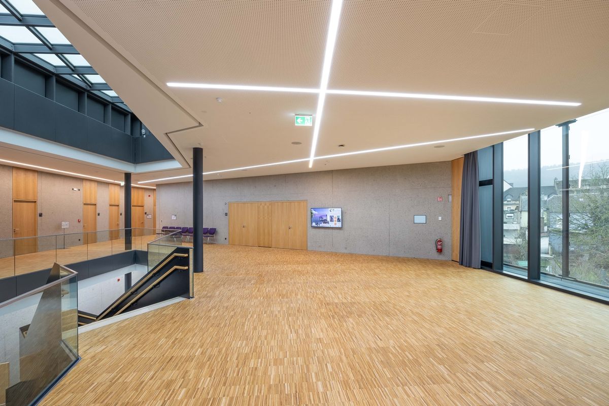 • 2 200 m² de constructions acoustiques en plaques de plâtre perforées au plafond